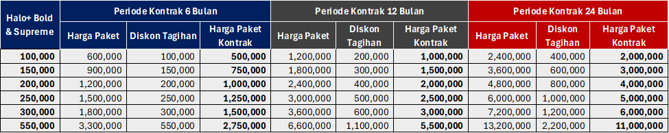 - Hanya berlaku untuk paket Halo+ Bold atau Supreme sesuai dengan table yang tertera diatas.